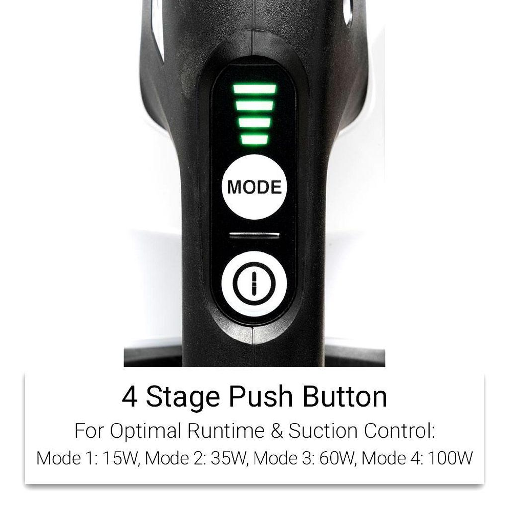 Suction Power : Mode 4: 100W | 3: 60W | 2: 35W | 1: 15W with high performance filter