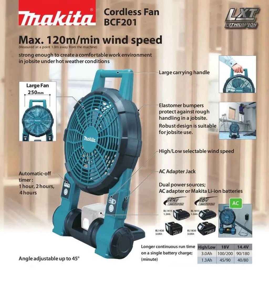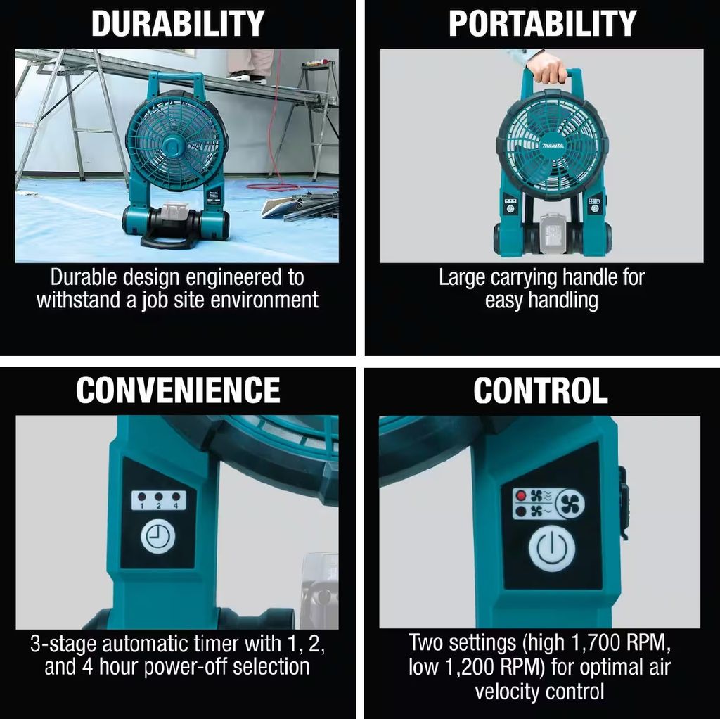 The DCF201Z has two settings for optimal air velocity control. It can be powered by Makita 18V Lithium-Ion batteries, or an AC adapter. The durable design and protective bumpers are engineered to withstand a job site environment.