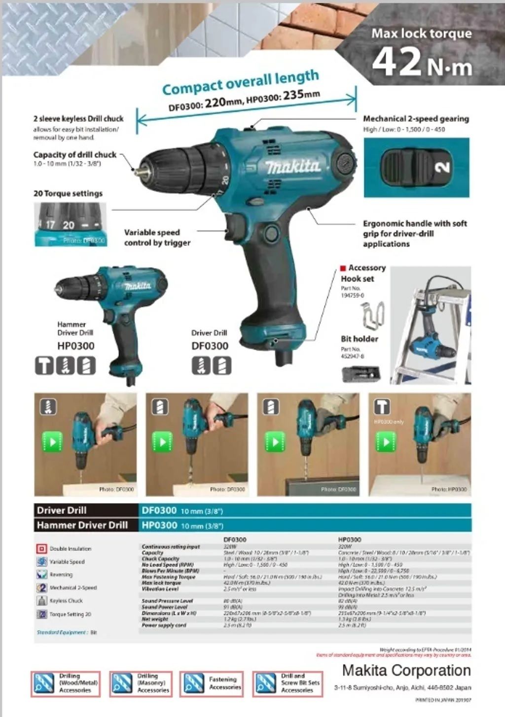 • Mechanical 2-speed gearing; High speed mode for speedy drilling in light duty applications; Low speed mode for heavy duty applications requiring high torque