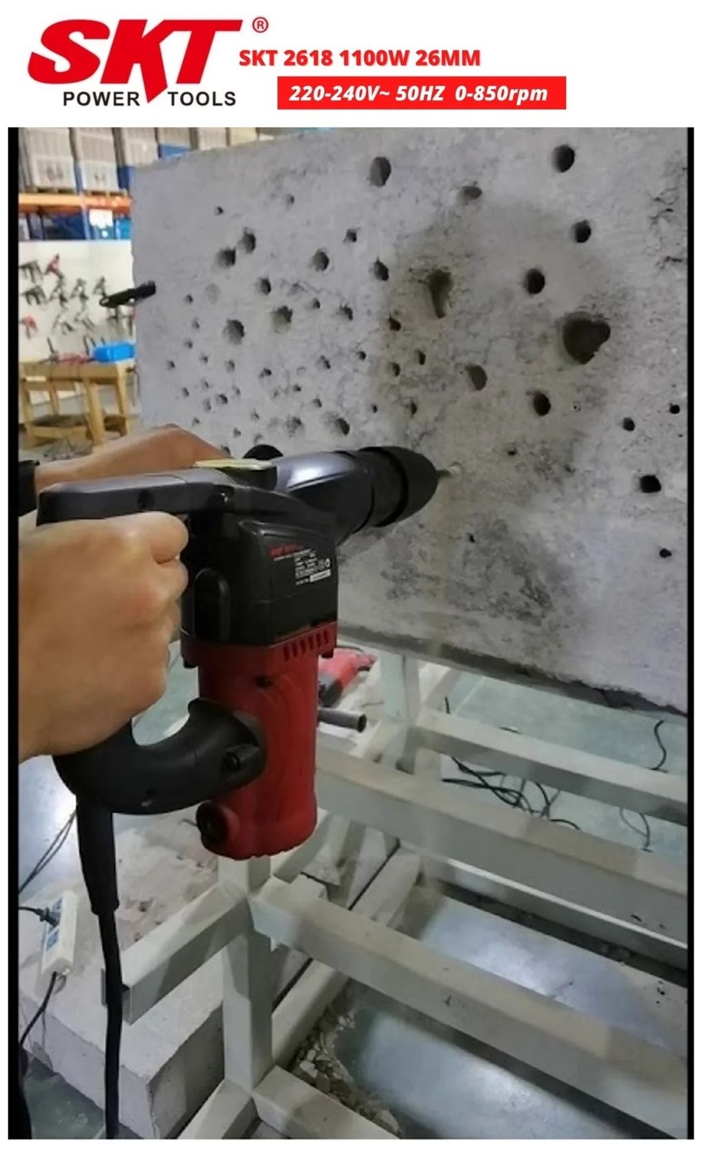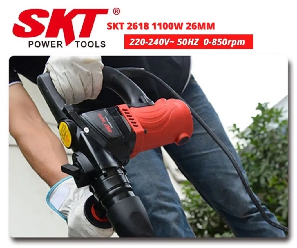 Use this powerful SKT demolition rotary hammer to drill into stone, concrete and other similar materials. With a power of 1100W and 3.0 Joule of impact energy you can easily make a lot of progress with your drilling and demolition work.