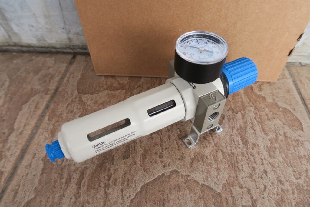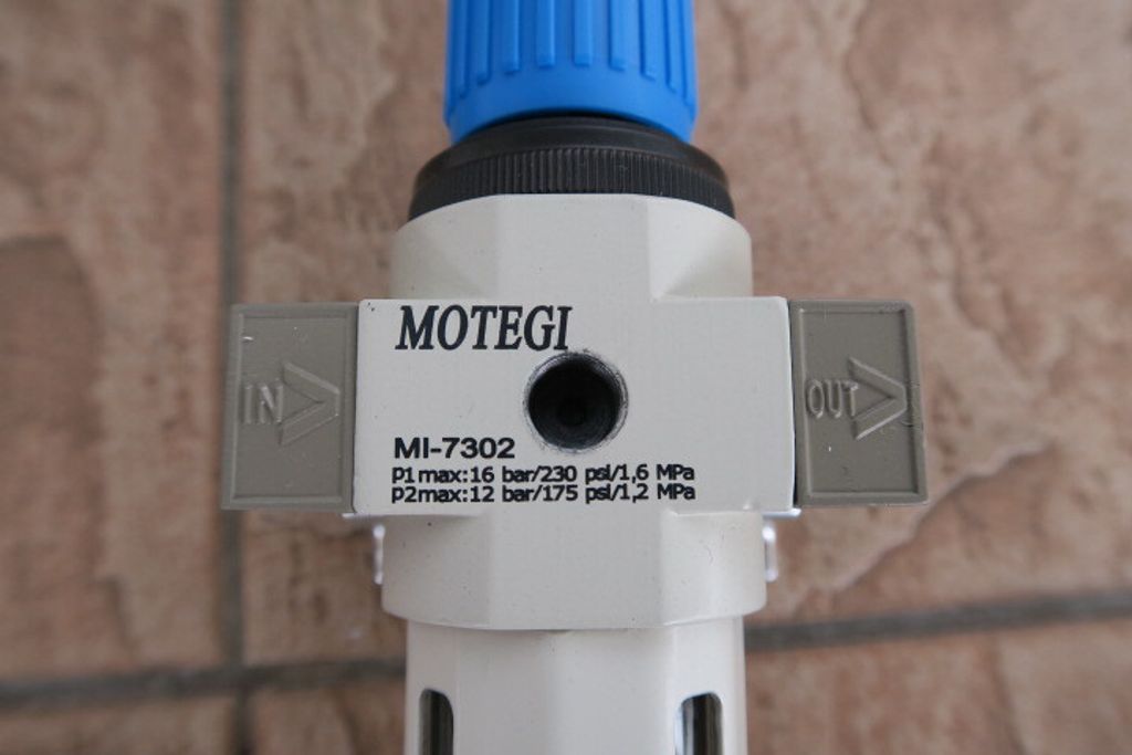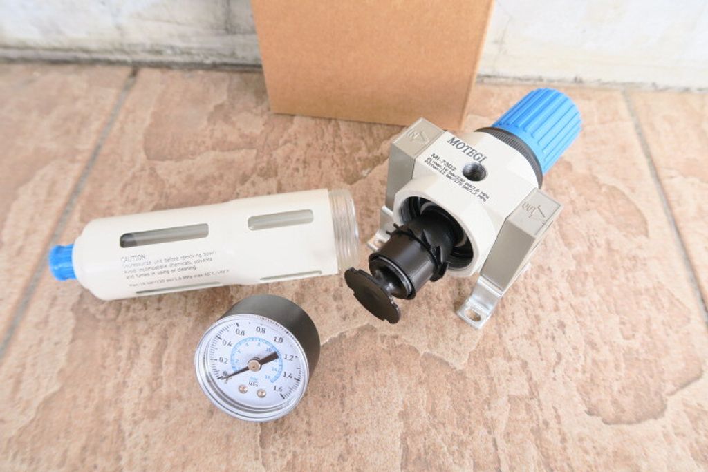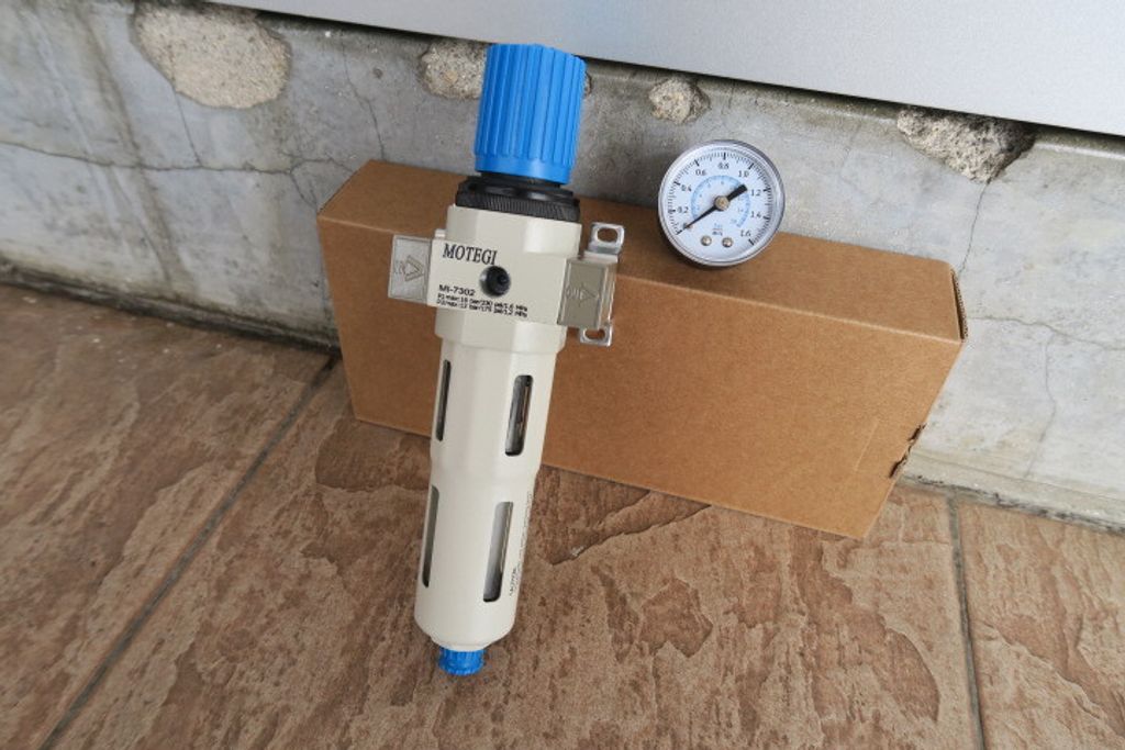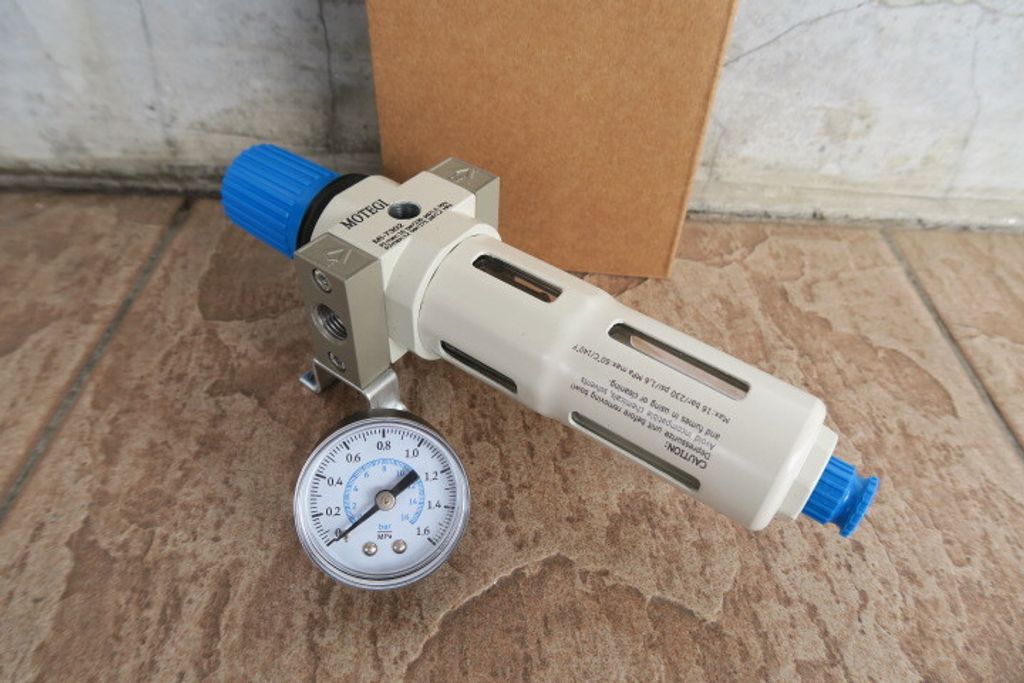 Motegi filter and pressure regulator combine a single unit,and cleans the compressed air of fluid oil, condensation and dirt particles.