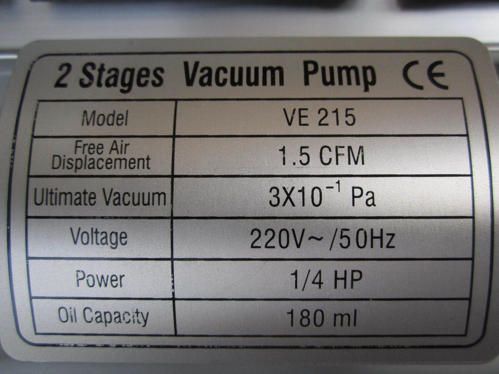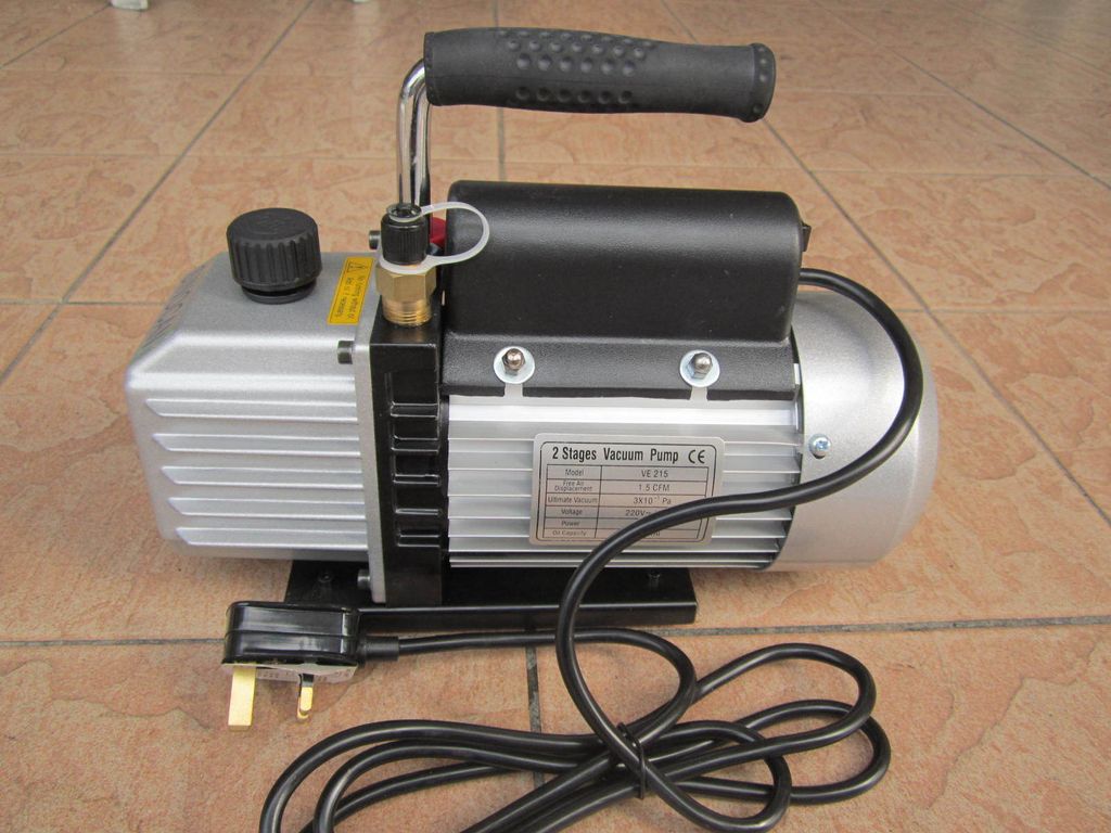 This two stage vacuum pump is CE approved and comes ready to operate. With an easy to carry design, it is smaller, lighter and more portable. This high performance, powerful pump provides free air displacement of 1.5CFM@50Hz and runs steadily for a long period of time. Comes complete with initial supply of high vacuum pump oil.