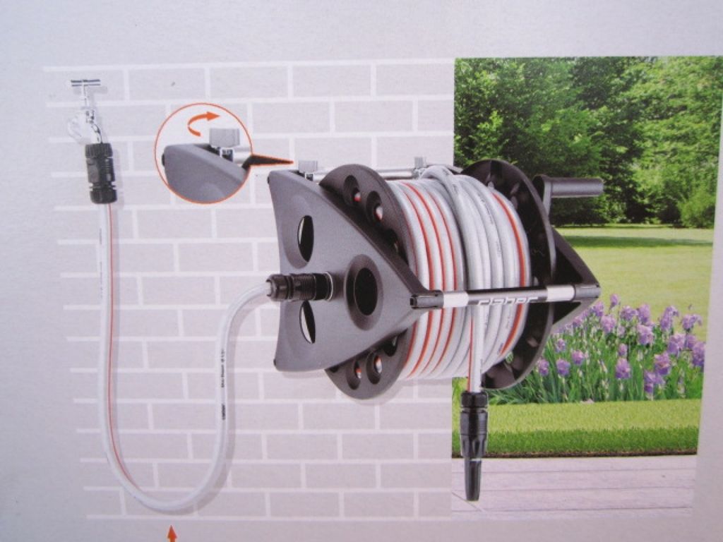 Wall-mounted hose reel with 20 m hose (Ø 12-17 mm) - 3/4” tap connector + 1/2” reducer - 4 automatic couplings - spray nozzle.