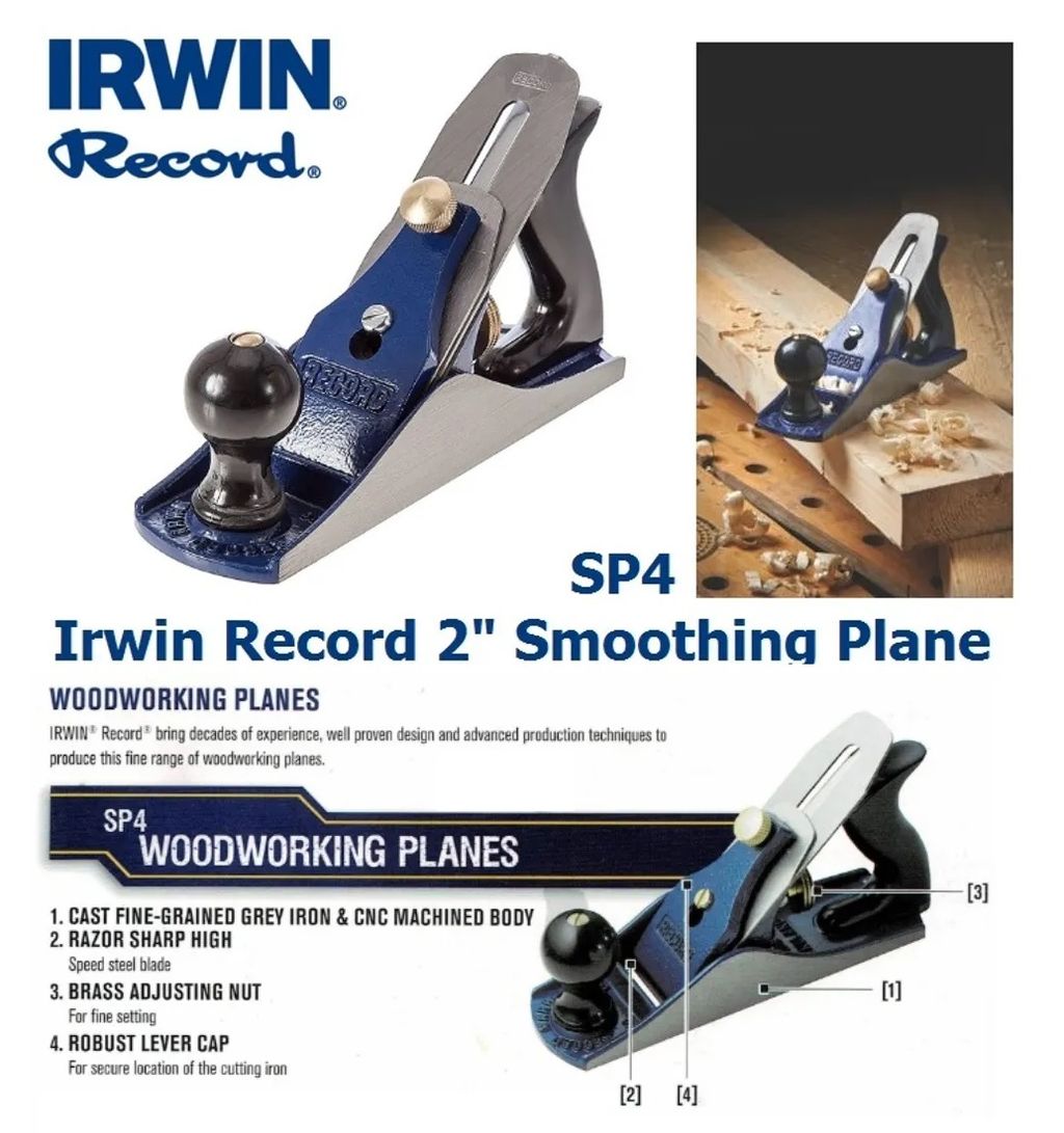 The Irwin Record TSP4 economy smoothing plane, with tungsten vanadium cutter is competitively priced and features, screw adjustment for depth of cut and lever for lateral adjustment.