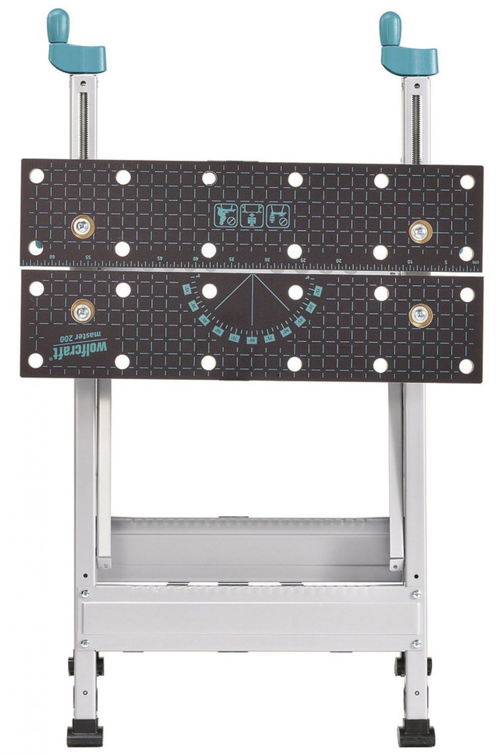 The MASTER 200 is a folding, multi-purpose clamping and working table with a durable MDF top. It offers a comfortable working height of 80 cm. The integrated tool ledge keeps your tools right at hand. Two cranks allow the 64.5 x 30 cm table surface of the MASTER 200 to be split. You can use the intermediate space created to fasten workpieces with a clamping width of up to 14.5 cm securely and effortlessly. The plastic vice jaws included in the delivery can be used for larger clamping widths of up to 36.5 cm by simply inserting them into the depressions in the tabletop provided for this purpose. Four plastic jaws for securing workpieces horizontally are included in the scope of delivery. You can fold the MASTER 200 flat to a space-saving 64.5 x 19 x 103.5 cm using a sturdy quick-folding mechanism with eccentric levers. Although it weighs only 12 kg, the table can support a 180 kg load and is extremely stable during use. As a result it not only offers flexibility, but also excellent stability.