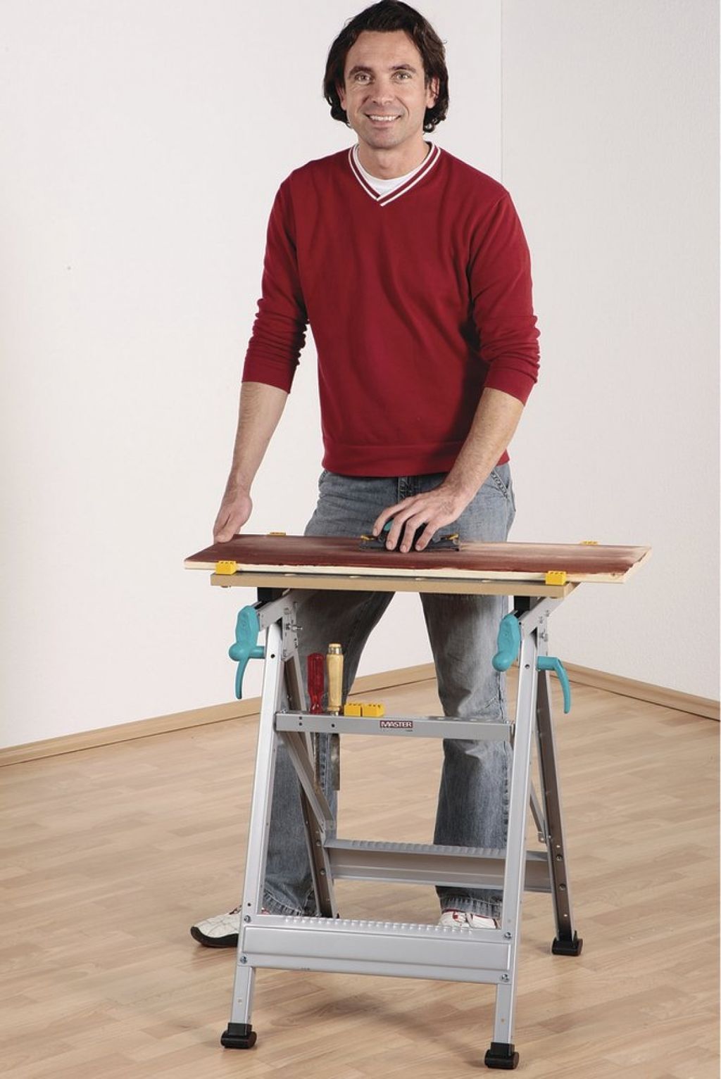The MASTER 200 is a folding, multi-purpose clamping and working table with a durable MDF top. It offers a comfortable working height of 80 cm. The integrated tool ledge keeps your tools right at hand. Two cranks allow the 64.5 x 30 cm table surface of the MASTER 200 to be split. You can use the intermediate space created to fasten workpieces with a clamping width of up to 14.5 cm securely and effortlessly. The plastic vice jaws included in the delivery can be used for larger clamping widths of up to 36.5 cm by simply inserting them into the depressions in the tabletop provided for this purpose. Four plastic jaws for securing workpieces horizontally are included in the scope of delivery. You can fold the MASTER 200 flat to a space-saving 64.5 x 19 x 103.5 cm using a sturdy quick-folding mechanism with eccentric levers. Although it weighs only 12 kg, the table can support a 180 kg load and is extremely stable during use. As a result it not only offers flexibility, but also excellent stability.