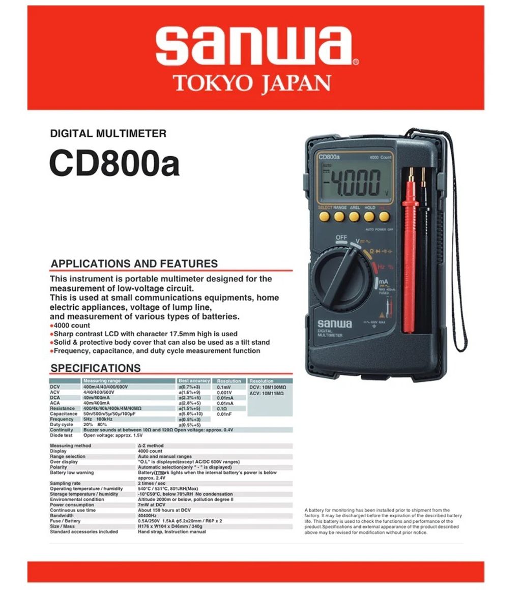Sanwa 600V Digital Multimeters Compact True-RMS Tester CD800a..
