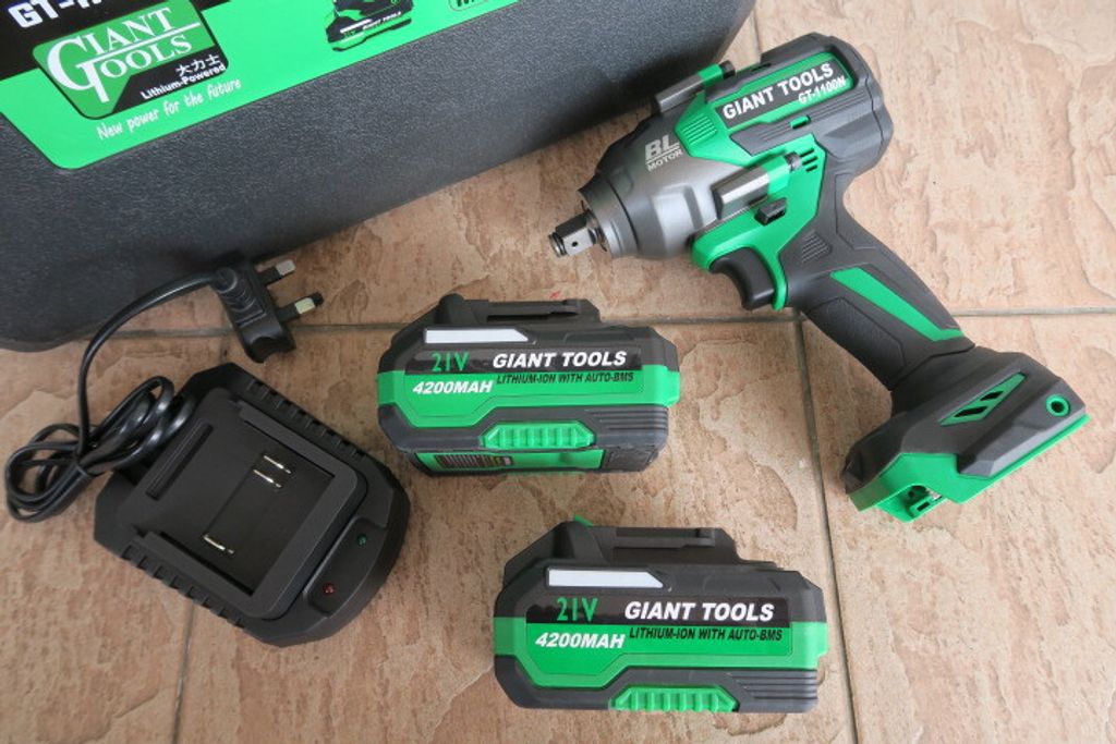 The Giant Tools GT-1100N impact wrench features brushless motor technology. It boasts 1100Nm Nut busting torque at 2200ipm, with 4-mode selections (3 speeds + auto stop). The Intelligent power supply prevents battery overload, overheating, and excessive discharge, ensuring maximum performance, and protecting the wrench.