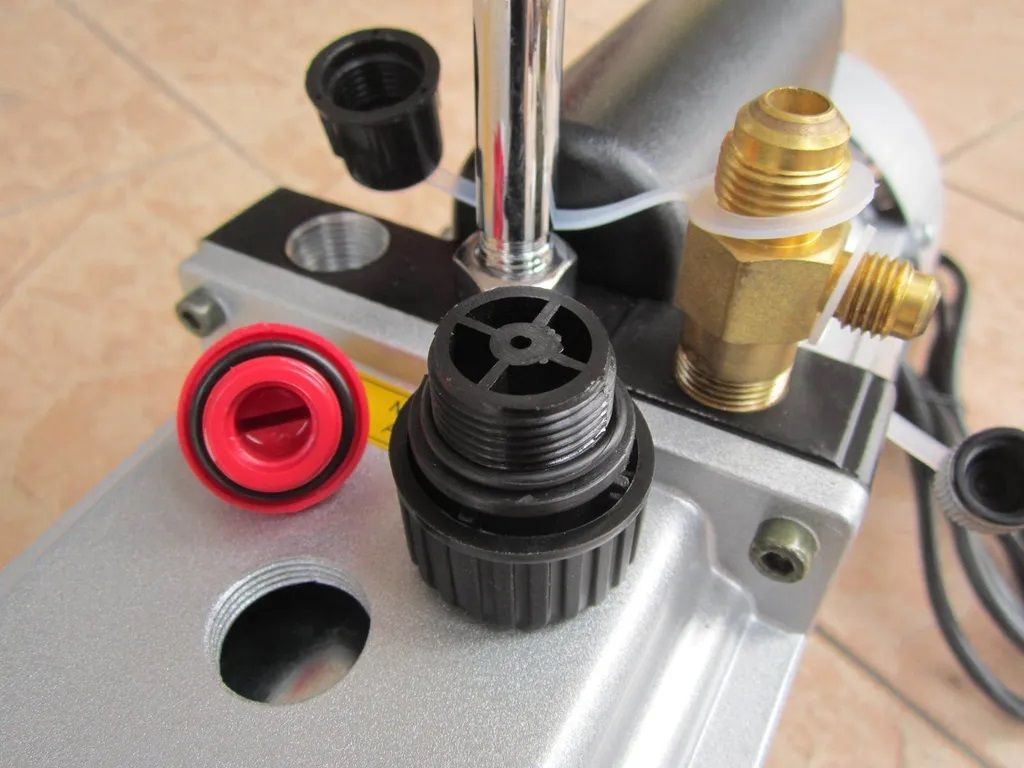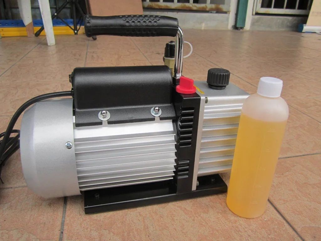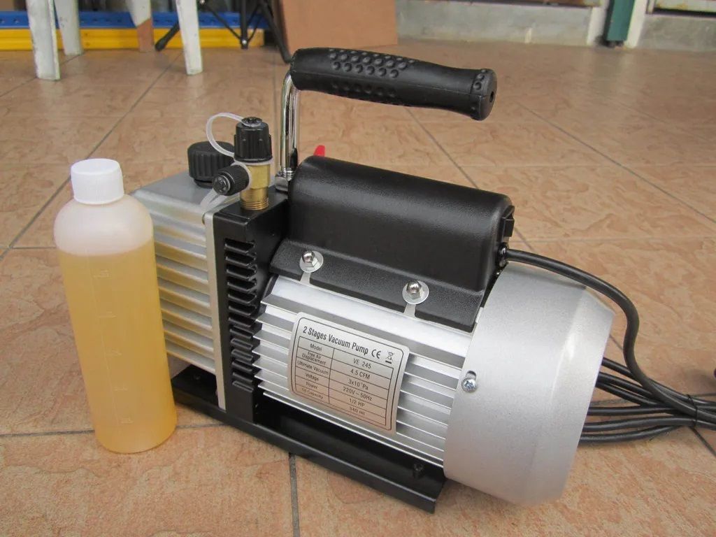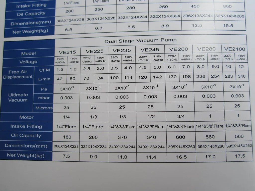 This two stage vacuum pump is CE approved and comes ready to operate. With an easy to carry design, it is smaller, lighter and more portable. This high performance, powerful pump provides free air displacement of 4.5CFM@50Hz and runs steadily for a long period of time. Comes complete with initial supply of high vacuum pump oil.